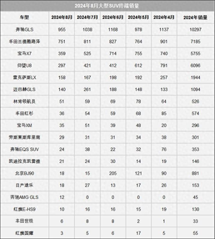 相比中大型SUV市場,大型SUV市場的可選車型并不是很多。在百萬元級別市場,奔馳GLS是銷量領跑者,寶馬X7雖然產品力不差,但因為品牌力的原因,在銷量方面相比奔馳同級別車型尚有差距。