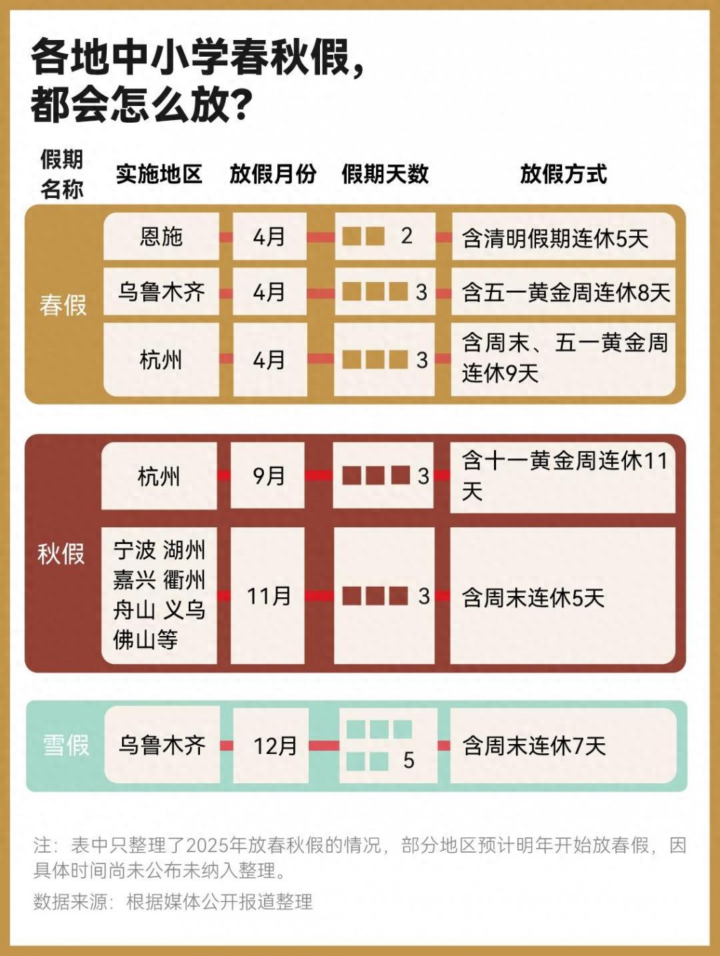 其實,“春秋假” 并非一個全新的概念。早在 2013 年,國務院辦公廳就曾提出地方政府可以探索安排中小學放春假或秋假。而杭州地區自 2004 年實施中小學 “春秋假”,至今已有 21 個年頭。今年 9 月,商務部等 9 部門印發相關文件,再次明確鼓勵有條件的地方探索設置中小學春秋假。到了 2025 年,更多地方開始積極落實這一政策,讓孩子們有了更多在春秋季享受假期的機會。