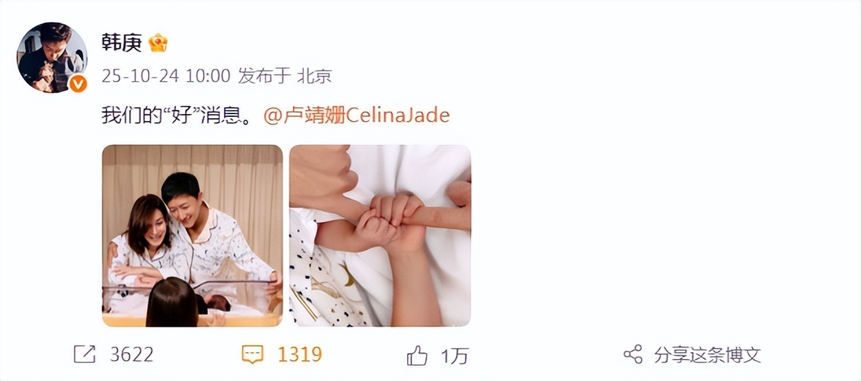 10月24日上午,韓庚和愛妻盧靖姍在個人社交平臺發(fā)文官宣二胎出生的好消息,夫妻倆附上相同文案:“我們的‘好’消息”。所以,盧靖姍和韓庚二胎是男寶寶誒,兒女雙全的他們湊成“好”字,真是恭喜恭喜了。韓庚和盧靖姍此次不僅發(fā)布相同文案,連時間都是卡的上午十點(diǎn)整,真的是小細(xì)節(jié)都充滿高糖,甜齁了。