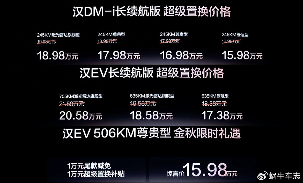 10月11日,比亞迪漢長續航版上市,其中,DM-i車型純電續航為245km,綜合續航達1560km;EV車型提供635km和705km兩種純電續航車型。該車系的起售價為15.98萬元,與老款漢低續航版本幾乎持平。