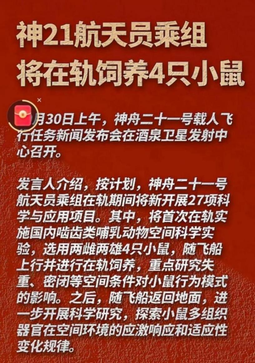 2025年10月30日上午,酒泉衛(wèi)星發(fā)射中心召開(kāi)了神舟二十一號(hào)載人飛行任務(wù)新聞發(fā)布會(huì),會(huì)上爆出一個(gè)挺有意思的消息:神21航天員乘組將在軌飼養(yǎng)4只小鼠,一公一母兩對(duì)兒。