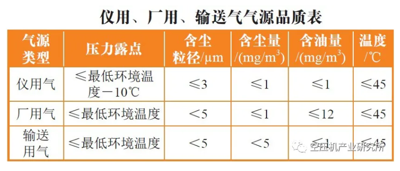 電廠壓縮空氣的品質(zhì),根據(jù)GB/T 4830-2015《工業(yè)自動(dòng)化儀表 氣源壓力范圍和質(zhì)量》、Q/DG1-J0110-2011《火力發(fā)電廠儀用、廠用壓縮空氣系統(tǒng)設(shè)計(jì)技術(shù)導(dǎo)則》以及《電力工程設(shè)計(jì)手冊(cè)-火力發(fā)電廠除灰設(shè)計(jì)》中相關(guān)規(guī)定,各氣源應(yīng)符合下表的規(guī)定。